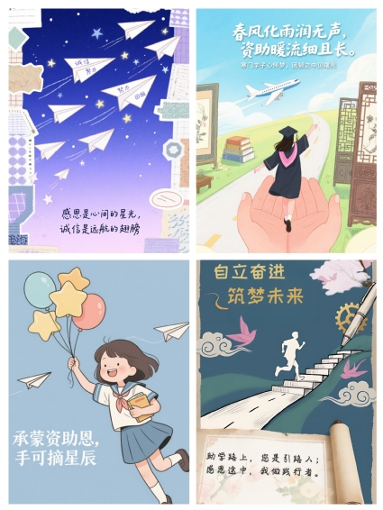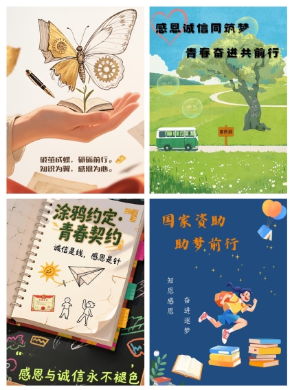 活动期间,同学们积极响应、踊跃参与,围绕“国家资助伴成长”“诚信点亮人生”“感恩筑梦前行”等主题,运用丰富的色彩、精美的构图和生动的文字,设计出一幅幅风格多样、寓意深刻的海报作品,展现了经管学子昂扬向上的精神风貌。