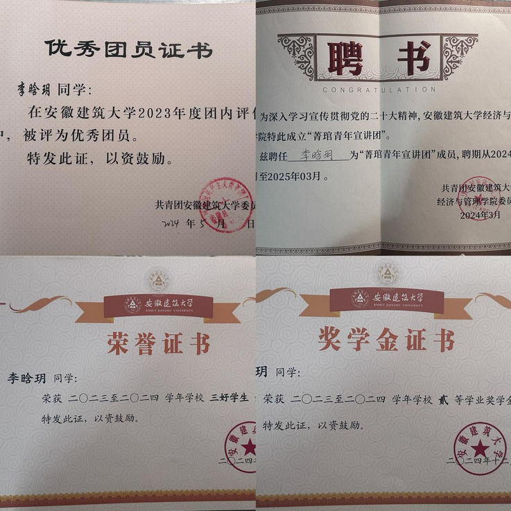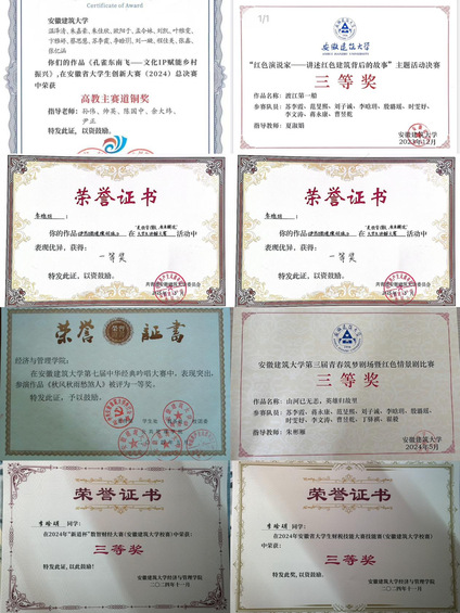 在课余之际,她热衷于开拓视野、充实自我。她从不止于书本,而是主动“走出去”,踊跃参与各项活动,培养多方面的能力。她参加菁琯青年宣讲团,参与学院宣传片的录制,在“美丽安徽 我来解说”校赛中荣获一等奖,在中华经典吟唱大赛中获得一等奖和最佳表演奖等。在不断尝试与挑战中,她愈发勇敢自信,以实际行动诠释青春当勇于探索,每一次突破皆为成长赋能。