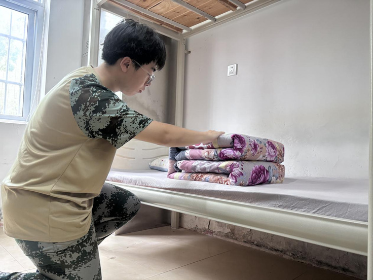 活动现场,教官们首先进行了精彩的示范,铺平、折叠、压实、捏线等动作干净利落,一气呵成。原本松软的被子在教官手中仿佛被施了魔法,迅速变成了棱角清晰、整齐划一的“方块”。同学们围拢在四周,目不转睛,发出阵阵惊叹。示范结束后,同学们在教官的耐心指导下开始动手实践。初次尝试,同学们手忙脚乱,教官们则穿梭其间,逐一纠正动作,讲解要领。在反复的练习和调整中,同学们逐渐掌握了技巧,手中的被子也渐渐有了“豆腐块”的雏形。虽然过程不易,但看到自己的劳动成果,同学们脸上都洋溢着成就感。