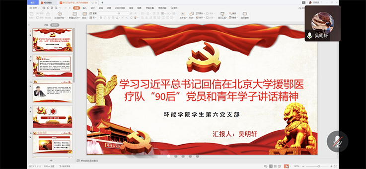 第三学生党支部以习近平总书记关于疫情防控重要讲话为主线,从“青春谱歌”“青春无悔”“抗疫小战士”三个板块展开,详细讲述了“生命摆渡人”快递小哥汪勇,“逆行出征、守护生命之光”援鄂护士李佳红,北京大学90后医疗队等抗疫英雄故事。第六学生党支部回顾了习近平总书记给北京大学援鄂医疗队90后”全体党员的回信精神,就身边的抗疫故事和如何发挥党员的先锋模范带头作用进行了热烈讨论。