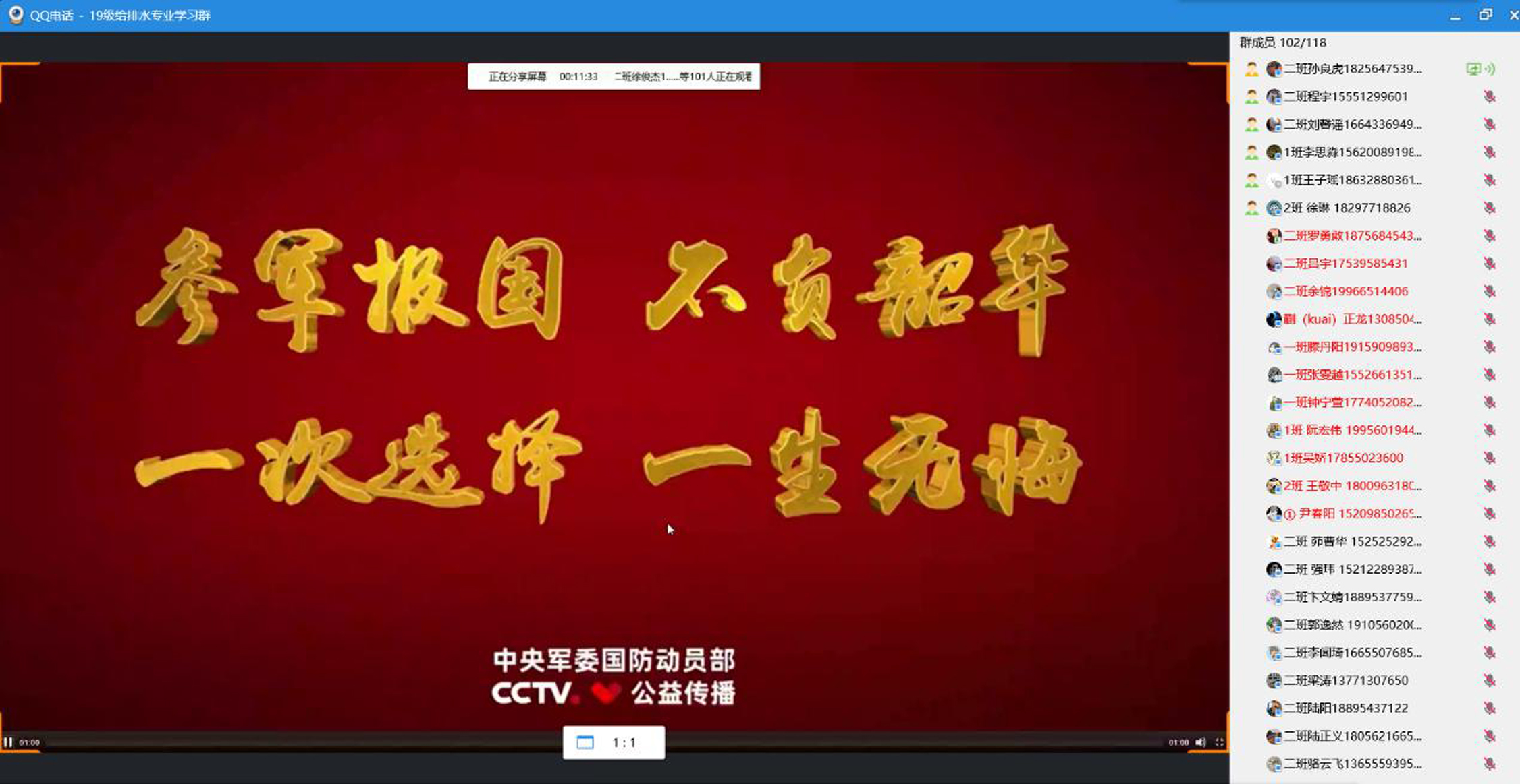在同学收看《参军报国不负韶华》和《逐梦青春》两部征兵宣传片后,辅导员就大学生参军相关政策进行了解读,鼓励广大同学在青春路上探寻初心、追逐梦想,把将爱党爱国融入基因血脉,积极投身强军兴军伟业,践行青年大学生使命担当和家国情怀。