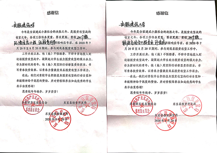 本网讯 近日,环能学院收到东至县团委、东至县扶贫开发局、东至县教育体育局联合寄发的感谢信,感谢环能学院计佳威、汪桂清两位同学利用假期积极参与东至县脱贫攻坚战、为东至县脱贫工作贡献建大力量,赞扬我校学子用实际行动彰显责任与担当。