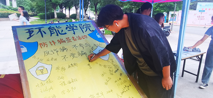 本网讯 为进一步提高同学们的防诈骗意识,保护学生的财产安全。日,环能学院在南校区开展“防诈骗”主题签名活动。