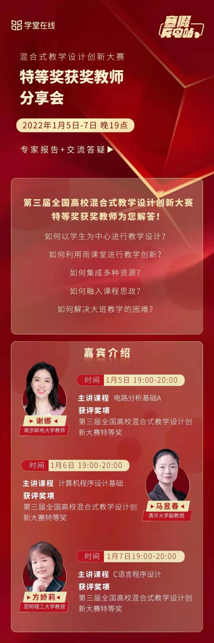 为深入推动高校落实立德树人根本任务,促进信息技术与教育教学融合创新发展,帮助我校教师进一步创新教学设计,真正达到“以赛促建、以赛促用、以赛促改”,教务处现联合雨课堂教学平台,在线特邀了在刚刚落幕的第三届全国高校混合式教学设计大赛中获得特等奖的三位教授,为大家分享教学创新大赛公益报告。现将具体事项通知如下:
