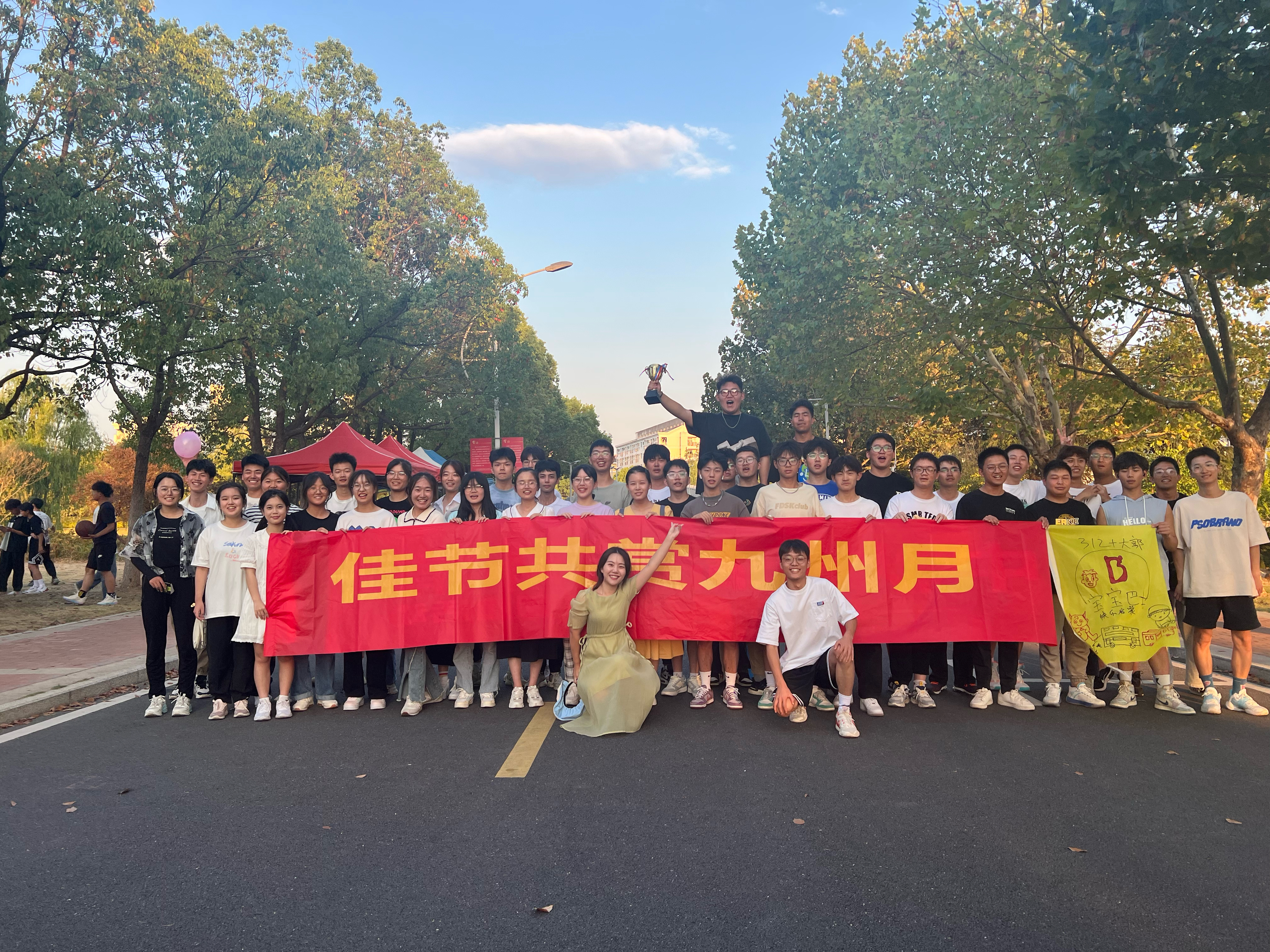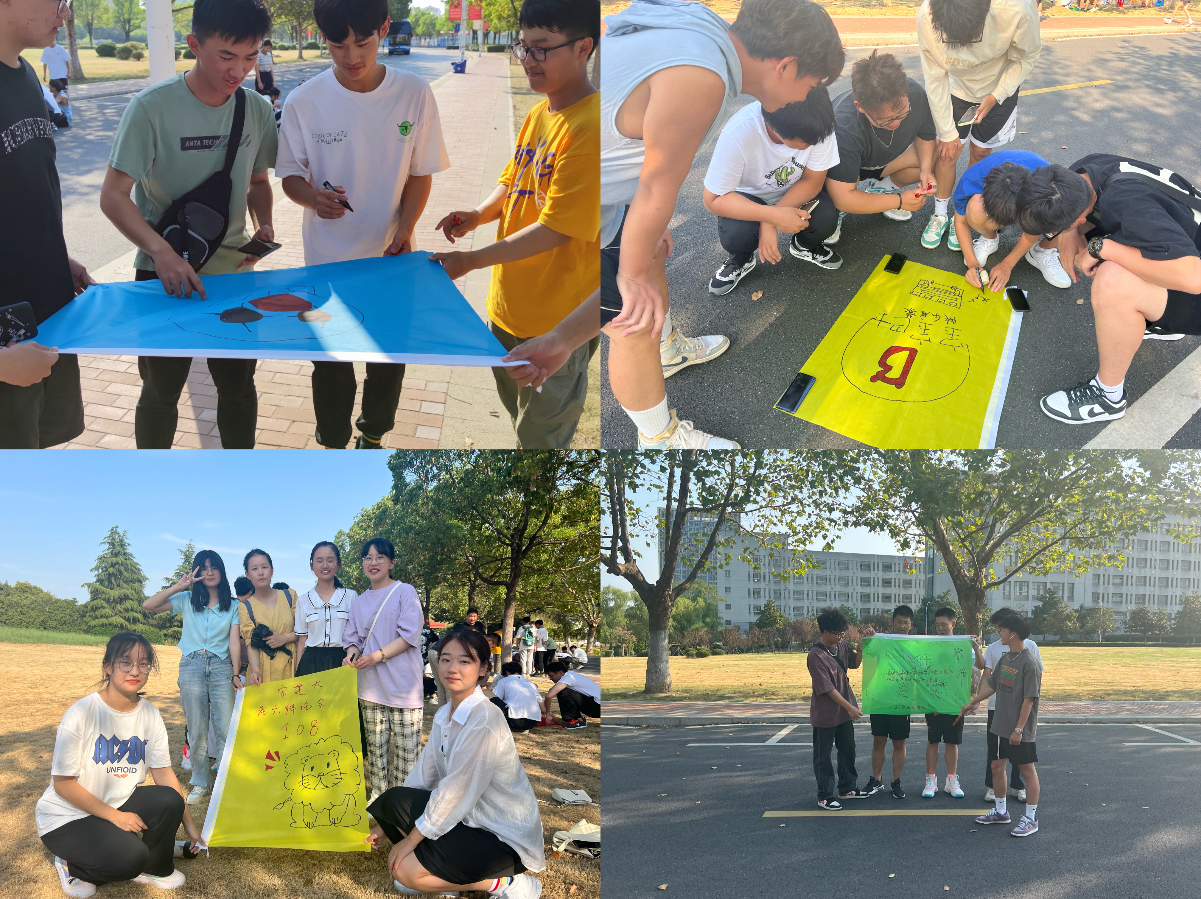 热场环节,同学们以寝室为单位,分发彩笔和旗帜,寝室成员团结协作十分钟之内画出寝旗、想好寝室名和口号,并向所有人展示寝室特色,宣扬寝室文化,畅想美好未来。团建活动中,以班级为单位,开展了“乒乓球接力”“拍篮球接力”“跳绳接力”和“拔河”四项趣味比赛,同学们秉承团结、和谐、拼搏的精神,充分展现了各个班级团结一致、协作配合的和谐状态。其余同学自动成为啦啦队,为本班上场的同学加油助威,现场的欢呼声一浪高过一浪。特别在拔河比赛中,几乎所有学生都冲到比赛场地,将整场活动推向高潮。