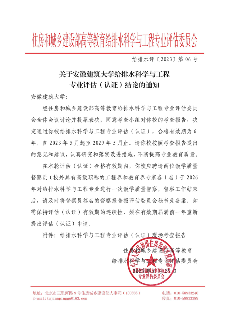 本网讯 近日,根据住房和城乡建设部高等教育给排水科学与工程专业评估委员会发布的《关于ku游官方给排水科学与工程专业评估(认证)结论的通知》(给排水评〔2023〕第06号)。ku游官方给排水科学与工程专业顺利通过评估(认证),合格有效期为6年,自2023年5月起至2029年5月止。
