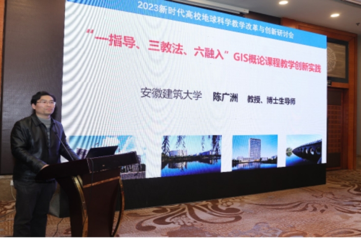 环能学院资源科学系主任陈广洲教授、教师代表潘邦龙和杜娟参加了此次研讨会。陈广洲教授在地理信息科学专业建设与课程教学分论坛作了题为“一指导、三教法、六融入的GIS概论课程教学创新”报告,结合参加教师教学创新大赛的经历介绍了在课程教学创新中的做法和成效。