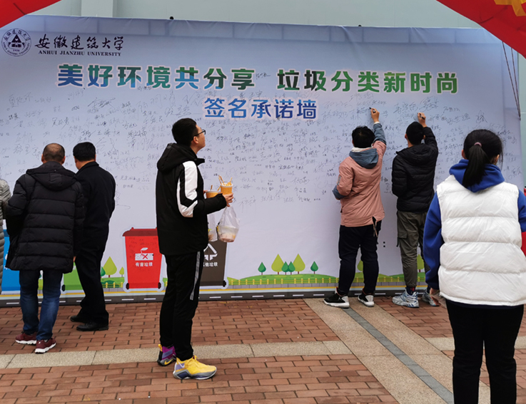 一份签名,一份承诺。活动现场,来往师生员工纷纷主动在签名墙上签字,并承诺将垃圾分类贯穿于日常学习与生活之中,以影响身边更多的同学、朋友参与到这场垃圾分类减量化、资源化、无害化的全民性工程的具体行动中。