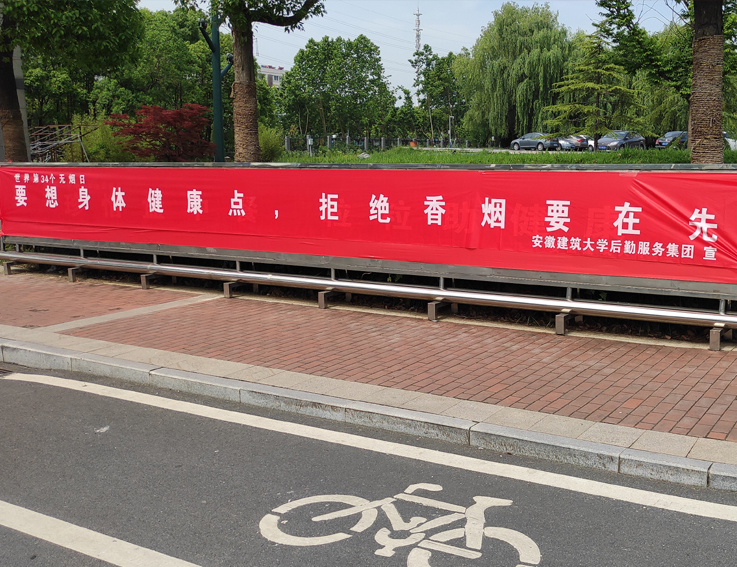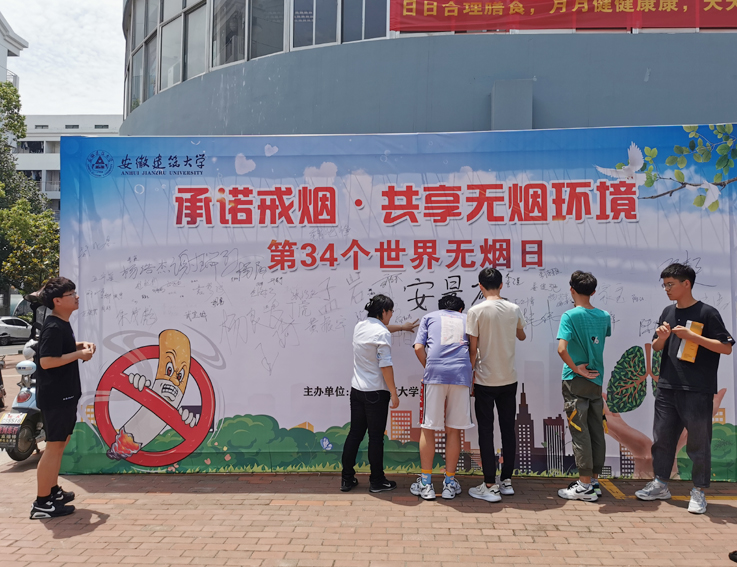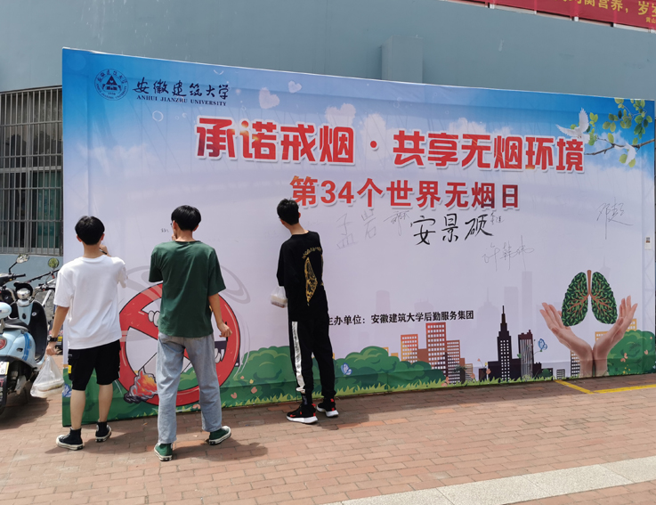 后勤服务集团精心安排,在校园主干道两边悬挂无烟日宣传横幅,在南校区紫云食堂和南苑食堂广场前搭起签名墙,摆放戒烟宣传板,引导来往师生员工参与到签名活动中,得到大家的积极配合和热情支持。