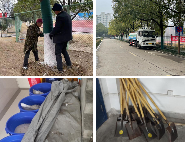 做好各项准备,细化应对措施。近日,后勤集团对南北校区树木全面剪修,为树木缠上防冻棉布。1月25日,又将除雪冲水车、鼓风机、铁锹、融雪剂等物资集中放置北校区,一旦处出现暴雪积雪,及时开展校园道路清扫、平房屋顶除雪、树木除雪等工作。确保道路畅通,树木不受损坏,教职员工出行便利。