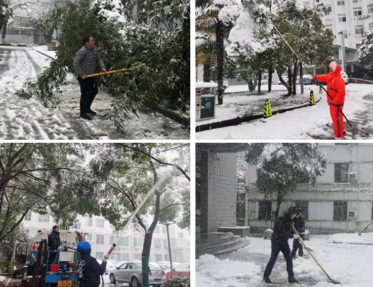 除雪采取机械和人工结合的方式开展,专业人员启动了了早就准备在校内的高压冲水车,清除高空树枝积雪。人工除雪人员纷纷拿起铁锹、扫把、竹竿等工具开展除雪活动。大家不畏寒冷,不辞辛苦,清理路面、树枝上的积雪,在每栋楼宇出入口及坡道处撒盐防冻,为校园出行安全提供了有力保障,在新春佳节里增添了一份节日的温暖。由于快速反应,迅速行动,边下边清,本次大雪未造成道路不通及压断树枝等现象,后勤集团将继续密切关注雪冻天气状况下的各项后勤服务保障工作。