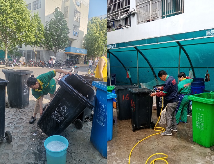 持续推动垃圾分类,提升主动分类意识。垃圾站主要集中在学生公寓楼下,日常使用油污较多,容易吸引蚊虫及蟑螂等四害,为持续推动垃圾分类工作,组织将南校区10余个垃圾回收站进行重新张贴宣传画,集中清洗垃圾桶及垃圾站,打造干净卫生的生活环境,劝导同学们提高垃圾分类、主动分类意识。