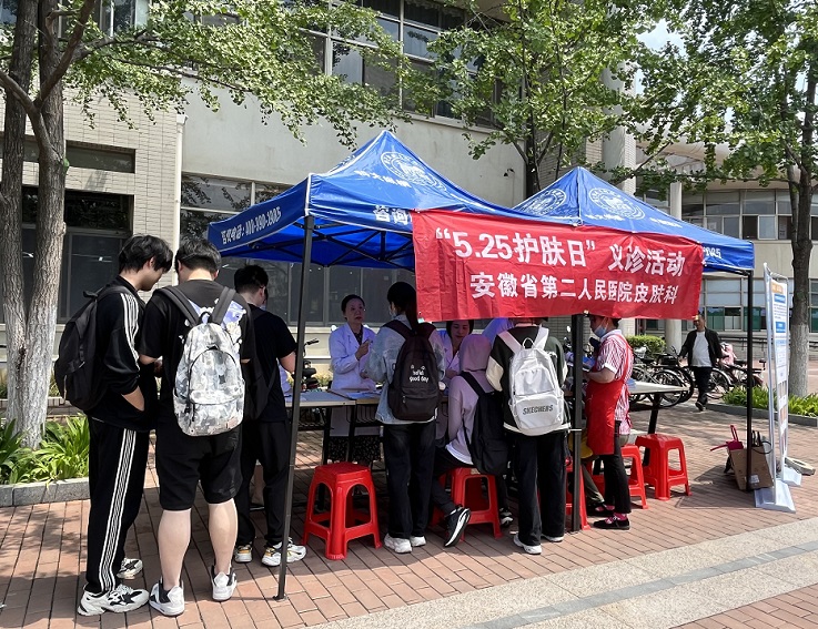 为加强广大师生对皮肤健康的重视与认知,学校校医院特邀安徽省第二人民医院皮肤科主任,主任医师,现任安徽省医师协会皮肤性病学分会常委戴前梅等人,于5月25日第十七届“全国护肤日”当天走进我校开展义诊活动,为师生科普关于皮肤问题的科学知识。在广大师生积极参与下,各皮肤科医生指导师生科学地保健护肤,预防皮肤病的发生;专业指导师生应对皮肤疾病,帮助师生解决皮肤健康困扰。