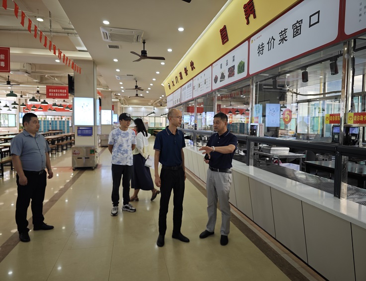 本网讯 为进一步加强学校食堂食品安全监管工作,落实辖区包保责任制,保障学校师生饮食安全,9月1日,合肥经济技术开发区锦绣社区管理委员会城市管理部王克兵主任一行来到学校南区食堂,查看食堂开学前各项准备工作,集团饮食中心人员陪同。