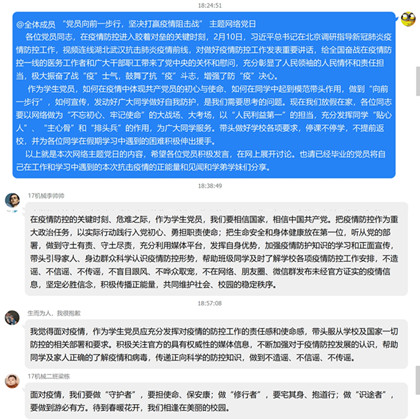 机电学院学生党支部开展网上主题党日活动,号召全体党员充分发挥同学“贴心人”、“主心骨”和“排头兵”的作用,为广大同学服务,带头做好学校各项要求,不提前返校,并为同学在假期学习中遇到的困难积极伸出援手。党日活动中,学生党员展开积极的网上讨论。