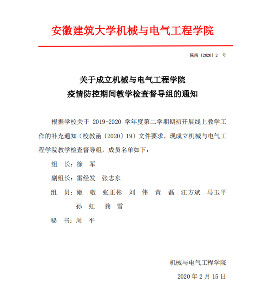 关于成立机械与电气工程学院疫情防控期间教学检查督导组的通知