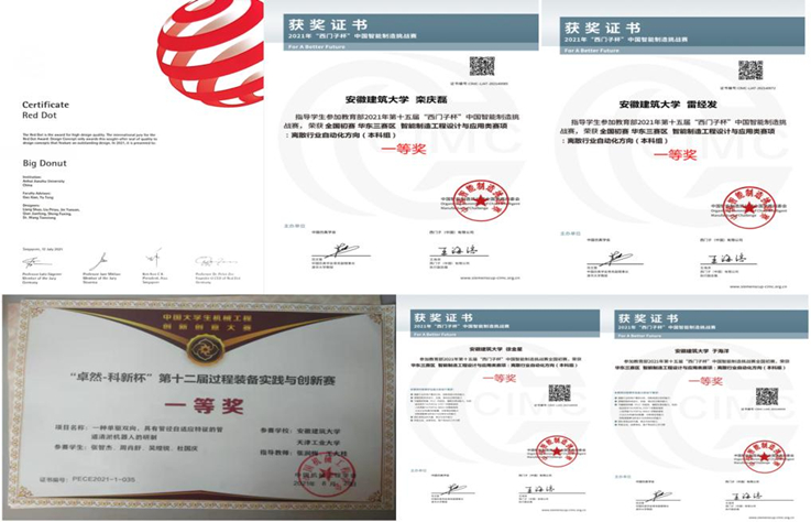 精耕细作,学科竞赛硕果累累。在各类学科竞赛中获国际级奖项1项、A类赛事奖项6项、B类赛事奖项62项。其中红点概念奖(Red Dot)1项;“西门子杯”中国智能制造挑战赛一等奖1项,二等奖5项;全国“卓然-科新杯”第十二届过程装备实践与创新大赛一等奖1项、二等奖3项、三等奖2项;第十四届“高教杯”全国大学生先进成图技术与产品信息建模创新大赛二等奖5项;两岸新锐设计竞赛“华灿奖”国赛1等奖一项、华东赛区一等奖4项;第七届安徽省“互联网+”大赛三等奖3项。