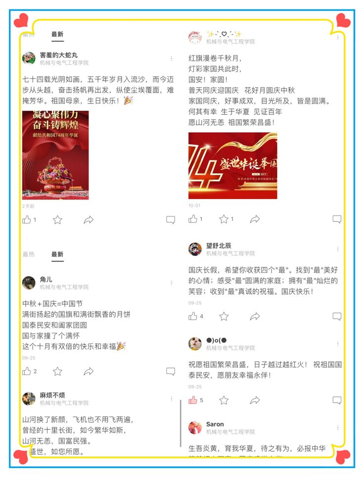 山河披锦绣,盛世写华章。为庆祝祖国74岁华诞,激发大学生爱国热情,凝聚奋进力量,机电学院易班工作站举办“机电‘易’起来——青春告白祖国”话题征集活动,鼓励学生以青春歌颂祖国,用文字赞美祖国。同学们在易班线上平台纷纷留言,表达对家乡日新月异的感叹,对祖国大好河山的赞美,对悠悠华夏文明的自豪。