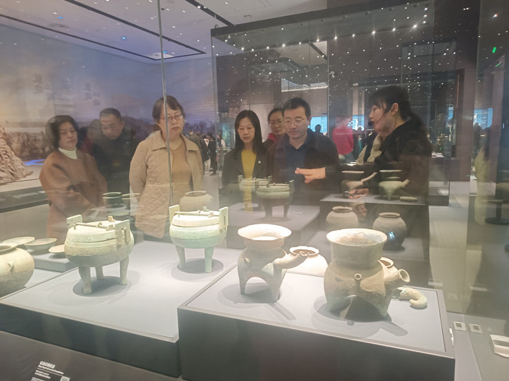 翌日,一行前往安徽楚文化博物馆。金青铜剑、箭镞弩机,淝水之战恍如昨日重现,三足羊首铜尊、镶玉金扣等,各色镇馆之宝精彩纷呈。在讲解员的带领下,大家依次参观各个历史陈列馆,神秘的青铜器、绚丽的陶瓷器、精美的漆器吸引大家驻足观赏、流连忘返。在“革命沃土”单元,党员们学习了革命先烈们的英雄事迹,追忆峥嵘岁月,接受了一场深刻的思想教育和心灵洗礼。