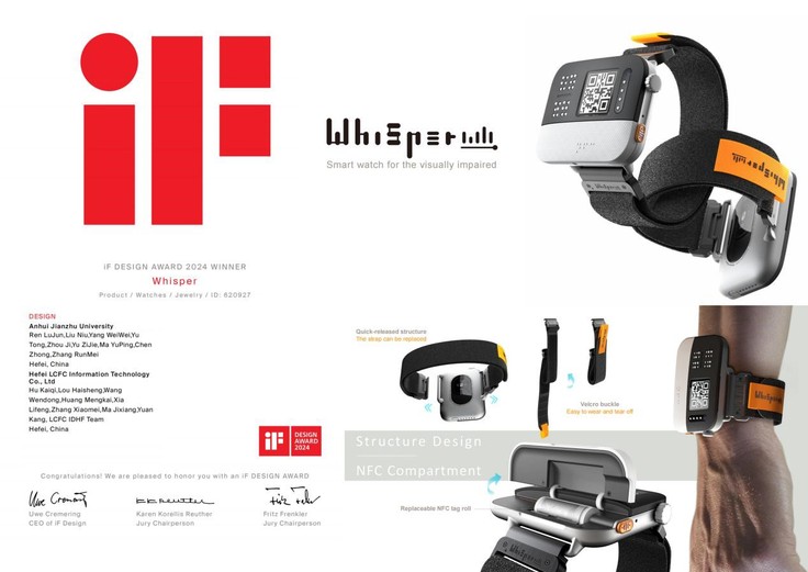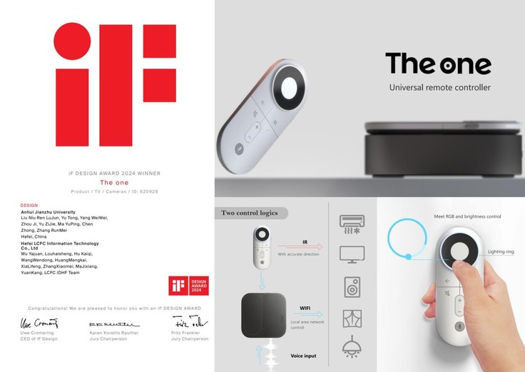 本网讯 近日,德国iF设计奖公布了2024年度获奖名单,机械与电气工程学院斩获两项国际工业设计产品组顶尖大奖德国iF奖:《Whisper视障人士智能手表》与《The One万能遥控器》。两款创新设计作品依托前沿技术与设计创新工作室,由我院工业设计系师生携手联宝(合肥)电子科技有限公司(以下简称联宝科技)共同打造。