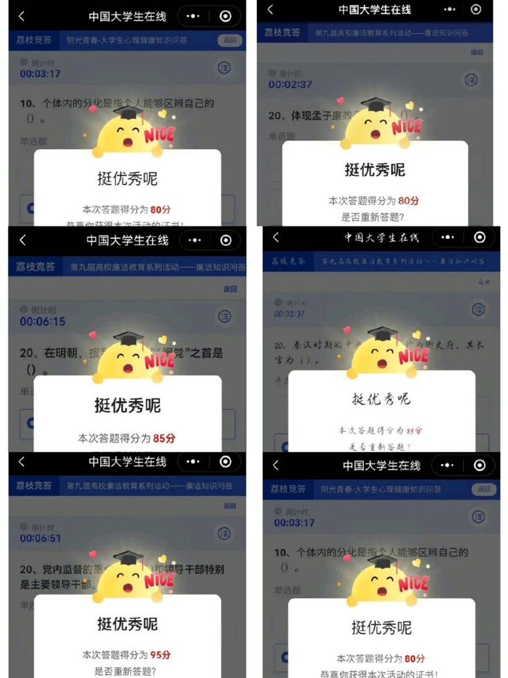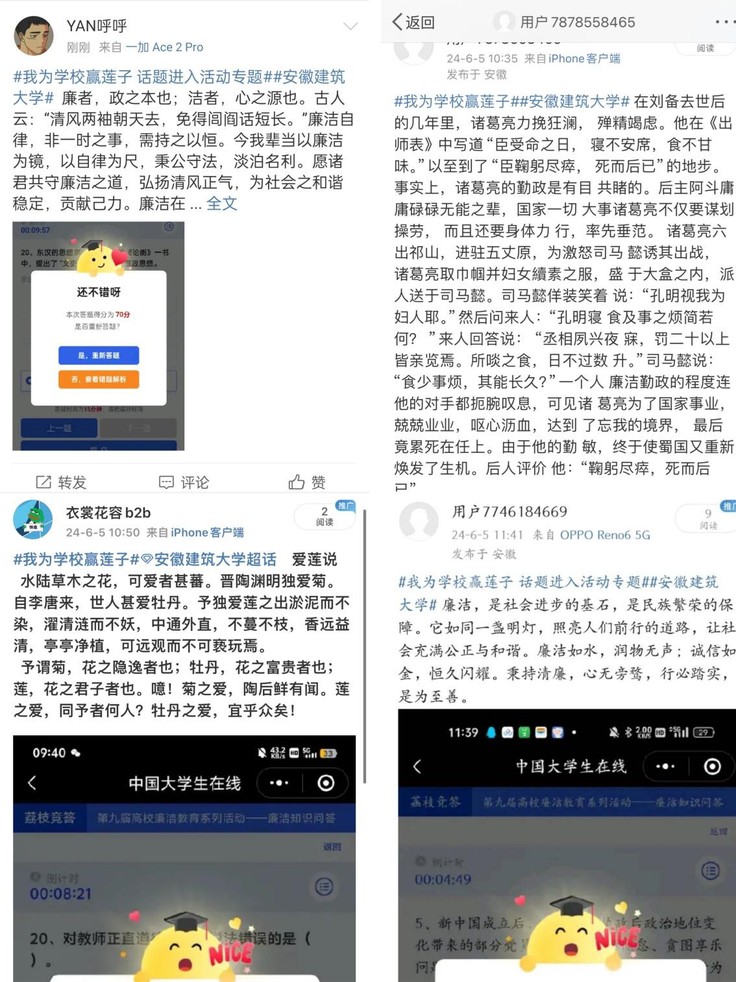 本次廉洁教育知识答题活动,以考促学,以考促廉,进一步夯实了师生清正廉洁思想根基,营造了风清气正育人环境。大家纷纷表示,廉洁文化是中华民族传统美德的重要组成部分,廉洁自律是每个公民应具备的基本品质,在以后的生活学习工作中将进一步夯实清正廉洁思想根基、厚植廉洁奉公文化基础、培养廉洁自律道德操守、弘扬崇廉拒腐社会风尚,打造优良的班风、学风、校风。(文:江双;图:胡文浩、张旭、王骏川;审稿:何鹤立)