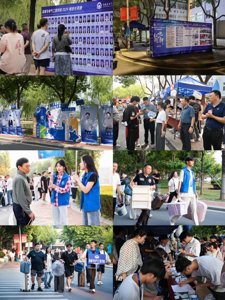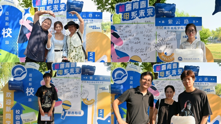 晨光初起,宿雾未散,新同学们早早地来到了报到地点,在“机小电·蓝马甲”迎新志愿者和党员志愿者的带领下,无缝迅速完成报到注册入住各项流程。迎新现场,家长和孩子们纷纷驻足在学院宣传栏、考研光荣榜和辅导员风采展示栏前,饶有兴致地观看展板内容,了解院情,并在签名墙前合影留恋。