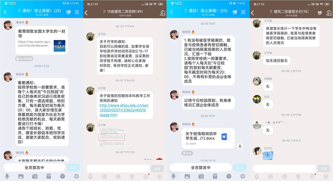 学工队伍积极投身防疫一线,强化意识、提高站位、守土尽责、发挥作用,始终坚守在引领学生思想认识、保障学生身心健康、维护校园和谐稳定的“第一线”。围绕学生、关爱学生、服务学生,针对学生的学习、生活、工作需求开展疫情期间的思想政治教育和日常事务管理工作。此外,学院辅导员在做好学生每日身体健康状况统计、电话回访的同时,积极解答学生假期的学业、就业等相关问题。为疫情期间的学子注入“强心剂”、送服“定心丸”。