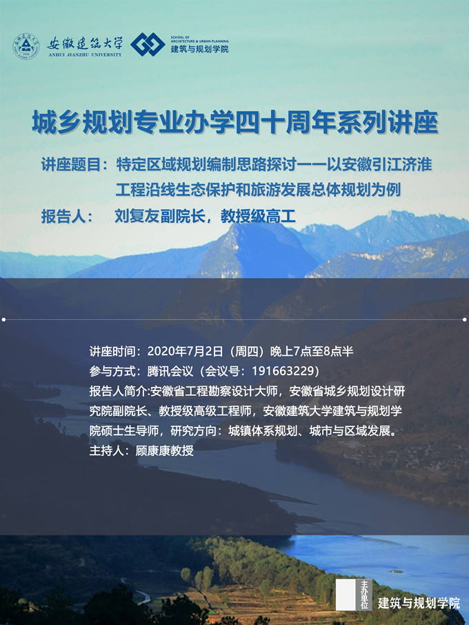 本网讯 7月2日晚7点,建筑与规划学院组织城乡规划办学四十周年系列讲座,邀请安徽省城乡规划设计研究院刘复友副院长主讲“特定区域规划编制思路探讨一一以安徽引江济淮工程沿线生态保护和旅游发展总体规划为例”,讲座由顾康康教授主持,建筑与规划学院70多位师生参加讲座。
