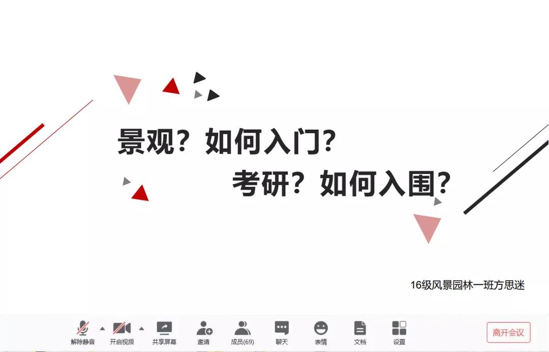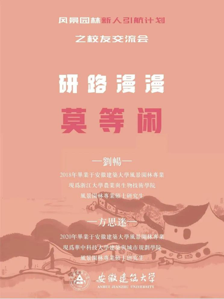 本网讯 10月16日晚,2020年风景园林专业“新人引航计划”第二场“研路漫漫莫等闲”分享会在建筑馆中庭展开。毕业于ku游官方风景园林专业的刘畅和方思迷两位同学受邀担任此次分享会的分享人。刘畅同学现为浙江大学农业与生物技术学院风景园林专业硕士研究生,方思迷同学现为华中科技大学建筑与城市规划学院风景园林专业硕士研究生。景观系系主任聂玮老师、李罡老师、王敉敉老师及2020级风景园林专业全体新生参加次此活动。18级风景园林朱志扬担任此次分享会主持人。