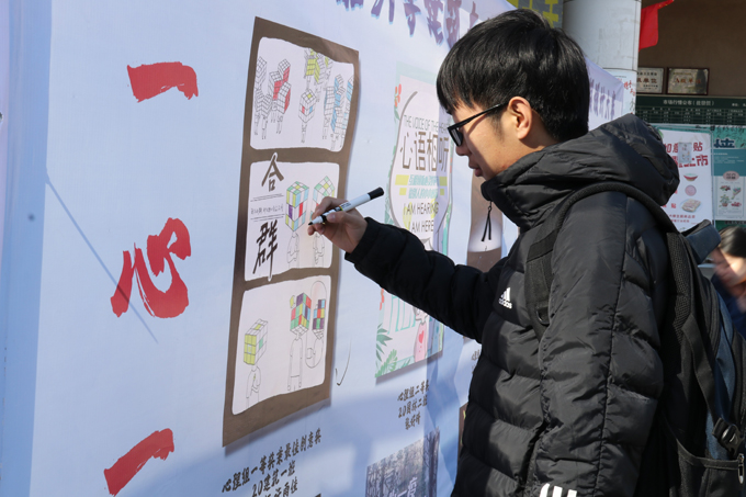 展览现场热闹非凡,气氛活跃,过路的师生纷纷接过现场工作人员提供的笔,在2020这非凡的一年的最后一天为自己最喜欢的海报投票,选出他们认为最使他们感动的海报。