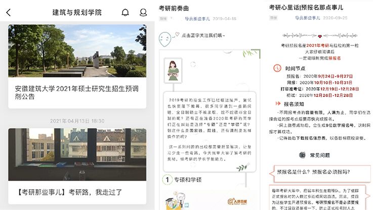 充分运用学院官方网站、新媒体平台、主题班会,通过学院微信公众号、易班·今日校园号、“导员那些事儿”微信公众平台,通过“考研那些事儿”、“考研前奏曲”、“考研心里话”、“考研后时代”、“建大人在美国”等系列推文,以诙谐幽默的方式,对考研的相关知识进行科普,助力毕业生国内考研和申请国(境)外学校,促进了学风建设,“考研”蔚然成风。