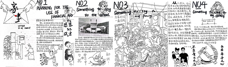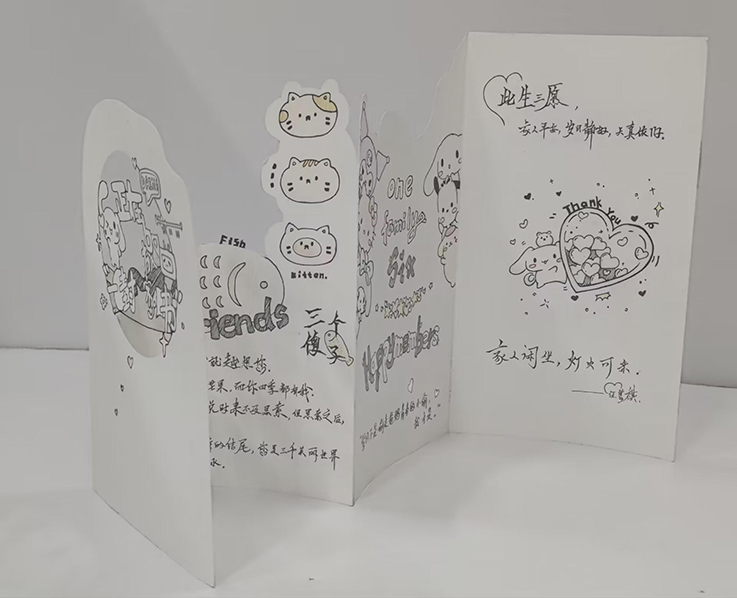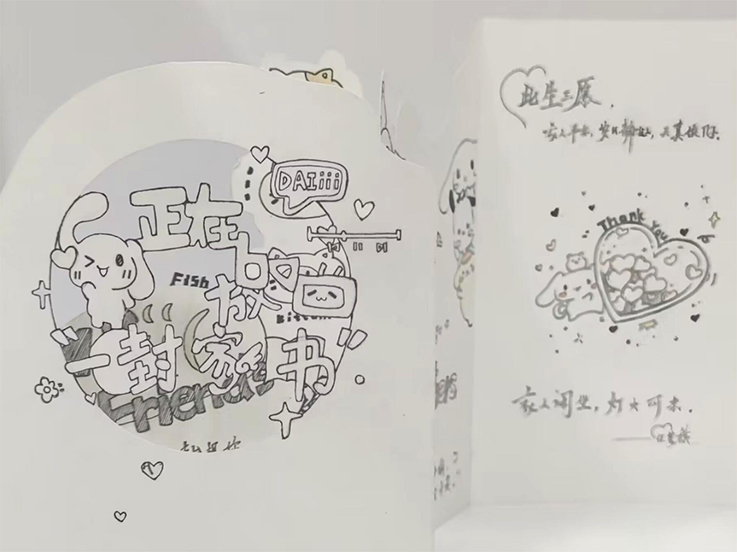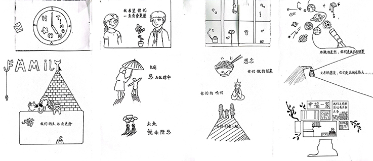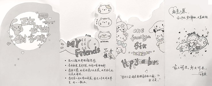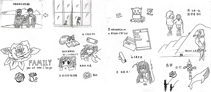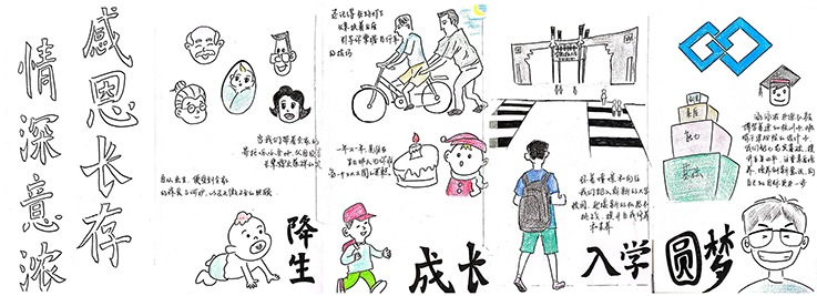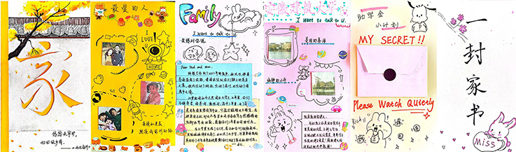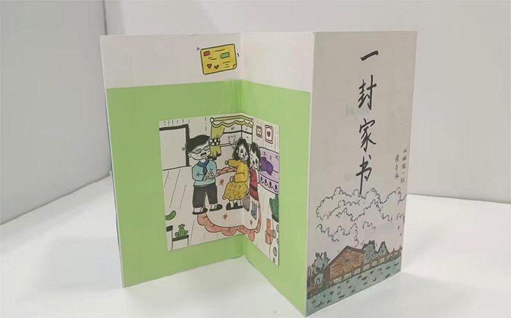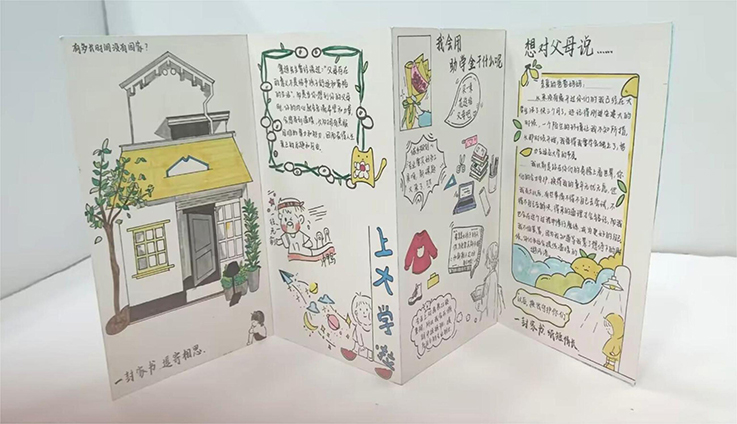 活动以“一封家书,一份真情”为主题。“写”家书的过程,也是同学们一次自我认识、自我教育,焕发出爱父母、爱家庭美好情感的过程。同学们以“家书”为桥梁,与家人深入交流,增进情感。此次“家书”从表现形式上一改传统书信的冗长文字,借鉴“连环画”概念,图文并茂,表达效果真切灵动,极富感染力。同学们在制作时采用镂空、拼贴等手法,使“家书”不仅传情达意,而且兼具趣味美观。