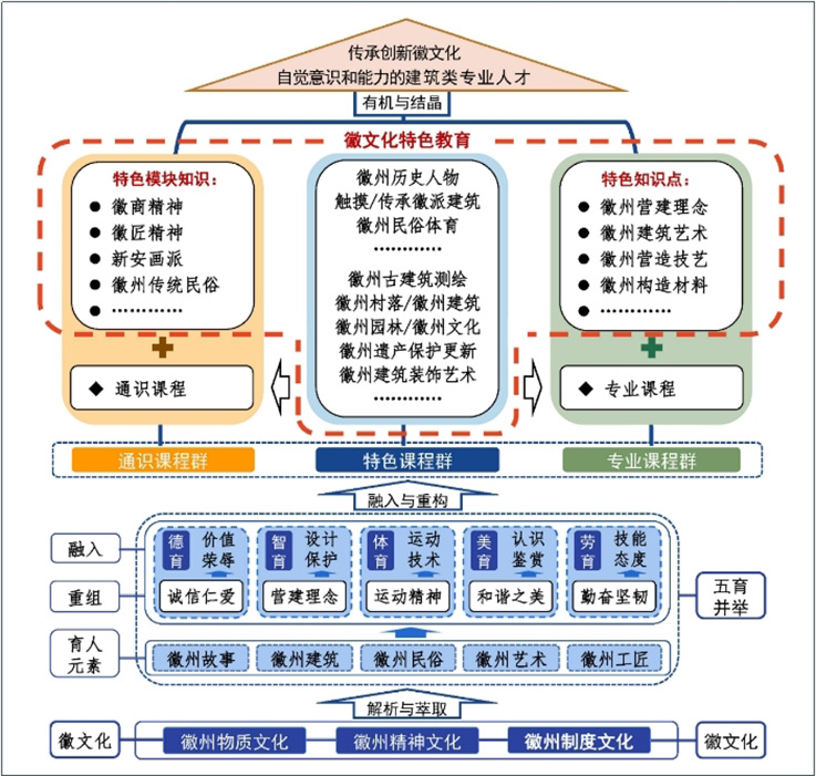 做好徽文章,打好“建”字牌,系统构建徽州建筑文化教育特色课程体系。开设“徽州文化、徽州建筑基础、徽州建筑保护、经典案例剖析”等必修或选修课程,通过通识课程+特色知识模块、专业课程+特色知识点、徽文化特色课程,将徽文化和徽州建筑、徽州村落教育贯穿于本科教育全过程,彰显文化育人特色培养模式。