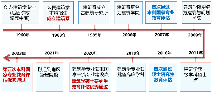 1960年创办建筑学专业,1983年成立建筑系,招收四年制本科,1995年改为五年制。建筑学专业分别于2007、2011、2015、2019、2023年通过住建部专业教育评估,2023年获得国家专业教育评估优秀通过。现为国家级一流专业、安徽省特色专业建设点、安徽省品牌专业、安徽省人才培养模式创新试验区、安徽省卓越人才教育培养计划实施单位。建筑学为学校重点学科、“安徽省新增博士学位授予权建设单位”建设学科和安徽省高等教育振兴计划重点建设学科。2007年获二级学科硕士点授权,2011年获一级学科硕士学位授予权,2016年,通过硕士研究生教育评估,2020年在全国高等学校建筑学专业研究生教育评估获得优秀等级通过。