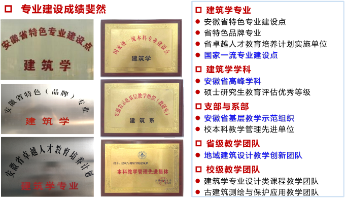 建筑学专业办学历史悠久、特色鲜明,办学质量稳定并不断提升,毕业生质量在国内外得到广泛认可。师资力量较雄厚,学科底蕴深厚,二级学科硕士点健全,在国内有一定影响力。经过35年的不断积累和五轮专业评估检验,依托学校“大土建”学科专业优势,构建了具有地域特色的建筑学专业人才培养方案,适应了学科发展、专业评估和社会需求;完善了人才培养课程体系和教材教案建设,构建徽州文化传承创新能力为导向的专业课程体系,编写特色教材教案;深度融合信息技术与教育教学,革新教学手段和教学方法,同步设计、开发虚拟教学课件,引导和鼓励网络优质课程资源的建设和运用,打造金课,切实提高课堂教学质量;以生为本,适度增负,加强学习全过程管理,进一步培养和提升学生综合创新能力;注重“政产学研用”一体化发展,加强实践平台内涵建设,实施产教、科教融合,校企合作,协同育人,成果广泛服务于地方经济建设。现已具有以下优势: