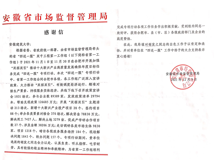 本网讯 近日,安徽省市场监督管理局就我校“四送一服”双千工程工作发来感谢信,对我校给予省“四送一服”第一工作组的支持表示感谢,对我校选派的谢发之、赵强两同志表示高度认可。他们全力以赴、认真负责、听从指挥、吃苦耐劳,具有较强的敬业精神和奉献精神,为省第一工作组顺利完成专项行动各项工作任务做出积极贡献,受到组内同志一致好评,获得合肥市、县(市、区)各级政府部门及企业的高度赞扬,工作组为此向学校发来感谢信。