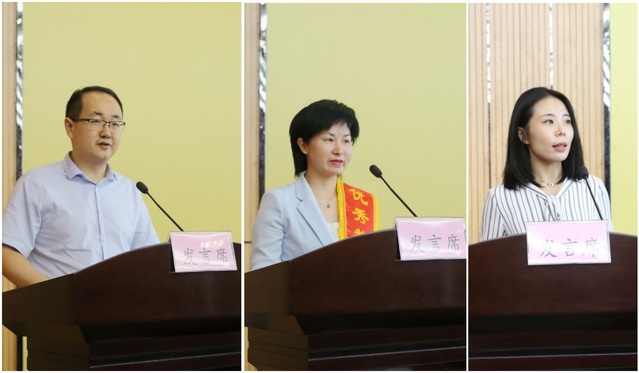 公管学院连瑞瑞老师、后勤集团韩小霞老师、经管学院戴克清老师分别代表优秀教师、优秀教育工作者和新进教师发言。连瑞瑞老师感谢了学校和学院的培养,作为建大一名老师他感到幸运和幸福;韩小霞老师从自身的工作谈起,表达了做一名园丁奉献一片爱心的情怀;戴克清老师分别从之于社会、学校、学生和个人四个方面表达了潜心科研、服务社会、与学校相互成就共生共荣、为学生树立德行典范和个人健康发展的情怀和决心。