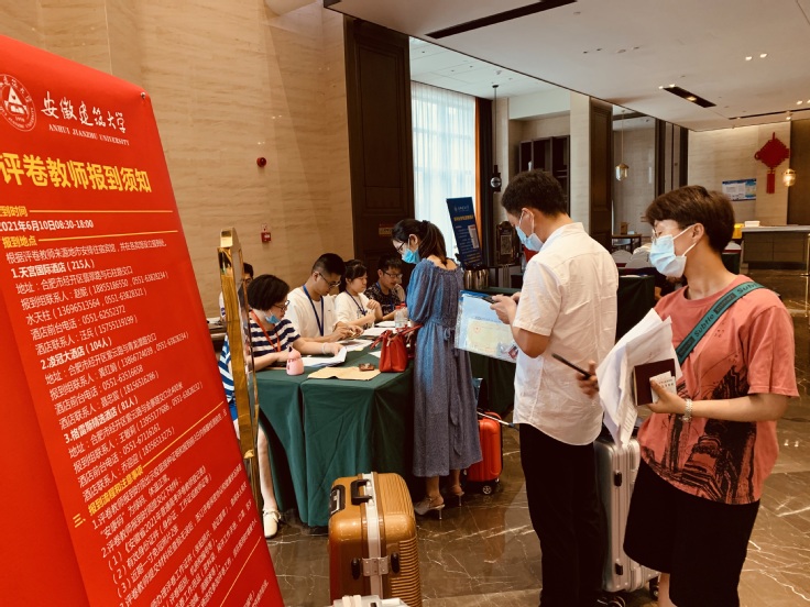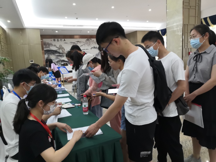 阅卷老师报到当天,由学院党员师生组成的接待工作组分布在三个报到点为阅卷教师办理报到手续。核查材料、办理手续、填写信息、物品领取,接待工作有序开展。