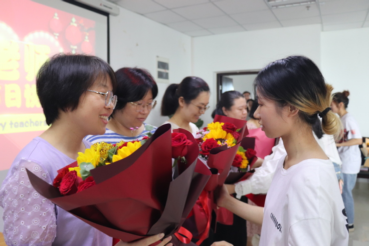 教师最大的快乐是来自学生的肯定,教师节也最希望收到来自学生的祝福。学生代表送上一首歌曲《风吹麦浪》诉说了教师无私奉献,日复一日,年复一年,黑板与粉笔摩擦声中,蹉跎了的光阴岁月。他们的无私奉献化作了辛勤的汗水,他们的爱心浇灌孕育了桃李芬芳。