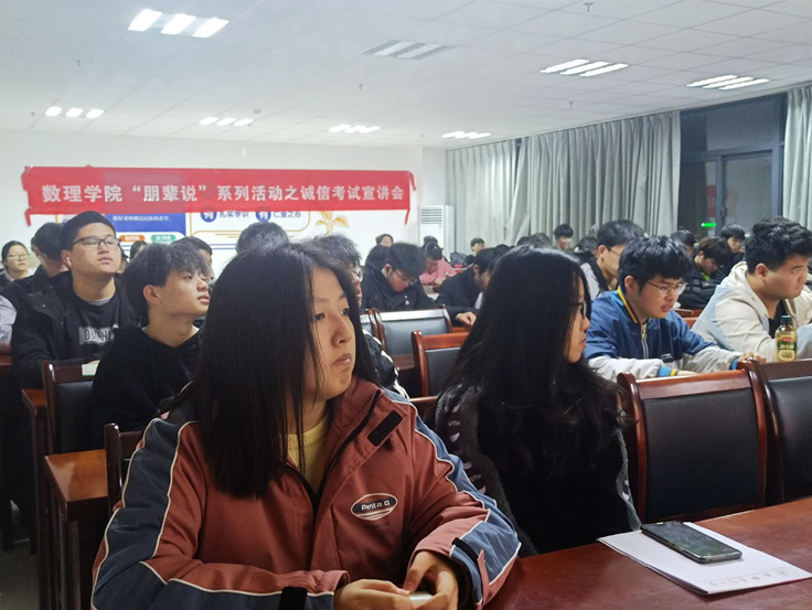 本网讯 为加强学风建设,严肃考风考纪,增强大学生的诚信意识,12月22日,数理学院在实验综合楼1306举办诚信考试宣讲会。