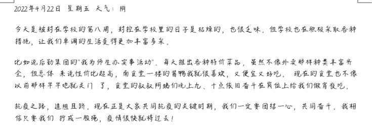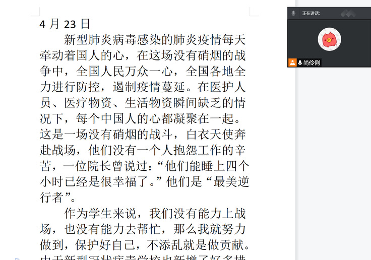会上,多名学生党员表示,面对疫情,要调整好心态,保持淡定;及时释放负面情绪,适时反思;鼓足勇气,向阳而生。19级声学1班宋喆说:“心有静气无难事,一群人一条路,坚持一起走下去,中国加油”;19级应用物理学1班程宏亮打气道:“愿破晓的曙光驱散阴霾,愿短暂的冷清换来久安。天总会亮,疫情总会过去”。学生党员们对打赢疫情防控“心理战”充满信心,互相勉励,积极分享自己在疫情下的幸福美好瞬间。