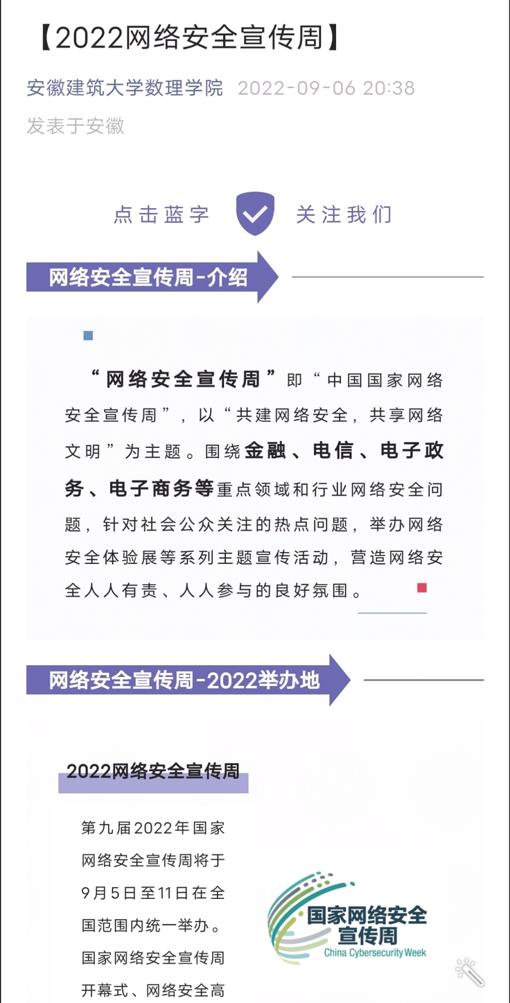 本网讯 2022年9月5日至11日为第九届国家网络安全宣传周,为推动宣传国家网络安全工作深入开展,增强广大师生的网络安全意识和防护能力,9月6-10日,数理学院通过线上线下相结合的方式开展网络安全的宣传活动。