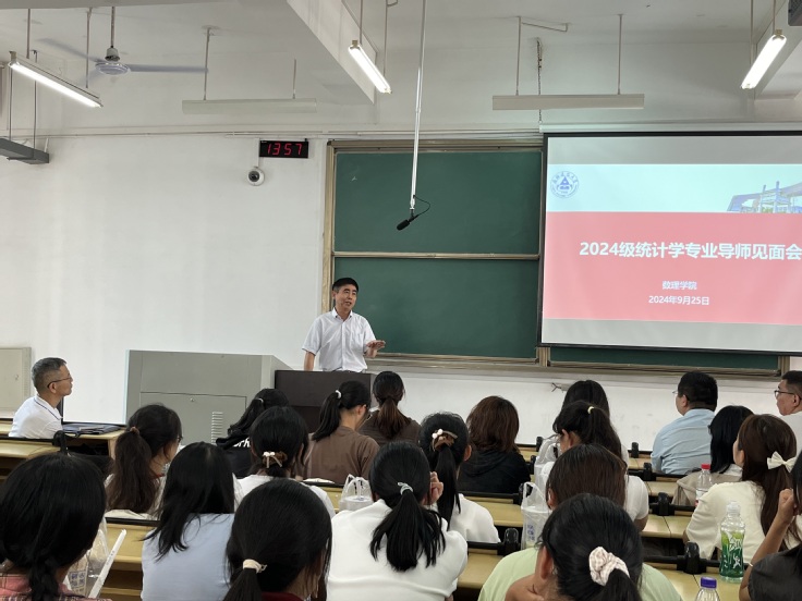 本网讯 9月26日,数理学院在逸夫楼教室分别召开2024级新生专业见面会。学院领导班子、各系主任、专业导师、教师代表、辅导员和近300名新生参加了本次见面会。