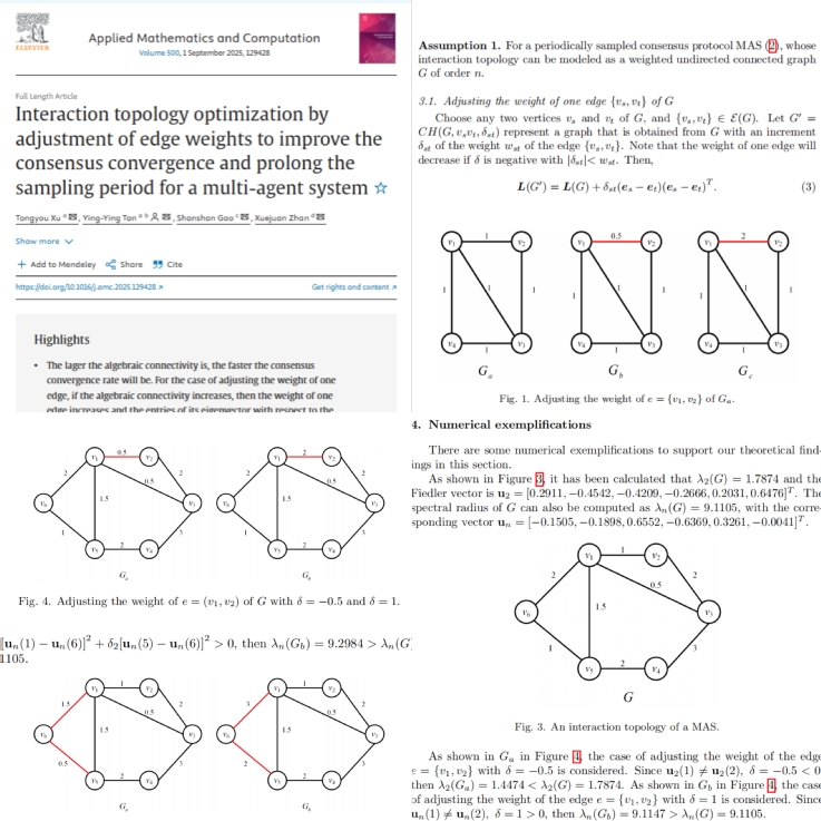 本网讯 近日,ku游官方数理学院2022级硕士研究生徐仝友以第一作者在应用数学领域权威期刊《Applied Mathematics and Computation》(JCR一区,中科院二区)在线发表题为“Interaction topology optimization by adjustment of edge weights to improve the consensus convergence and prolong the sampling period for a multi-agent system”的学术论文。ku游官方为论文的第一完成单位和通讯单位。