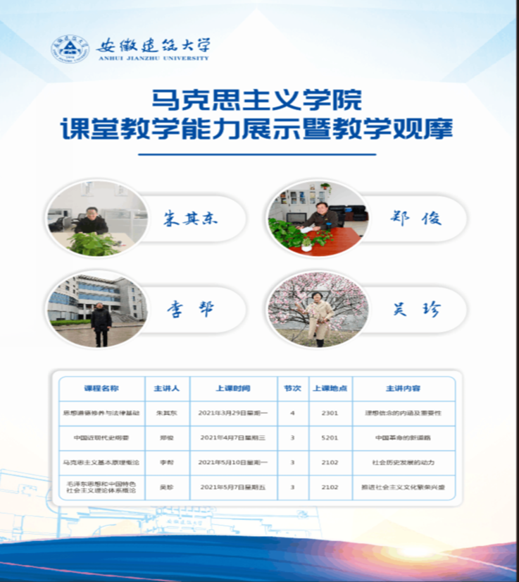 课堂教学能力展示暨教学观摩活动既为教师展示教学水平提供了舞台,又为其锻炼成长搭建了平台,同时也为教师之间相互学习、交流研讨创造了机会。接下来的两个月,另外三位老师将陆续进行教学能力展示。马克思主义学院将扎实推进此次系列活动,力争不断提高学院课堂教学整体水平。(作者:张杰;审核:刘晓君)