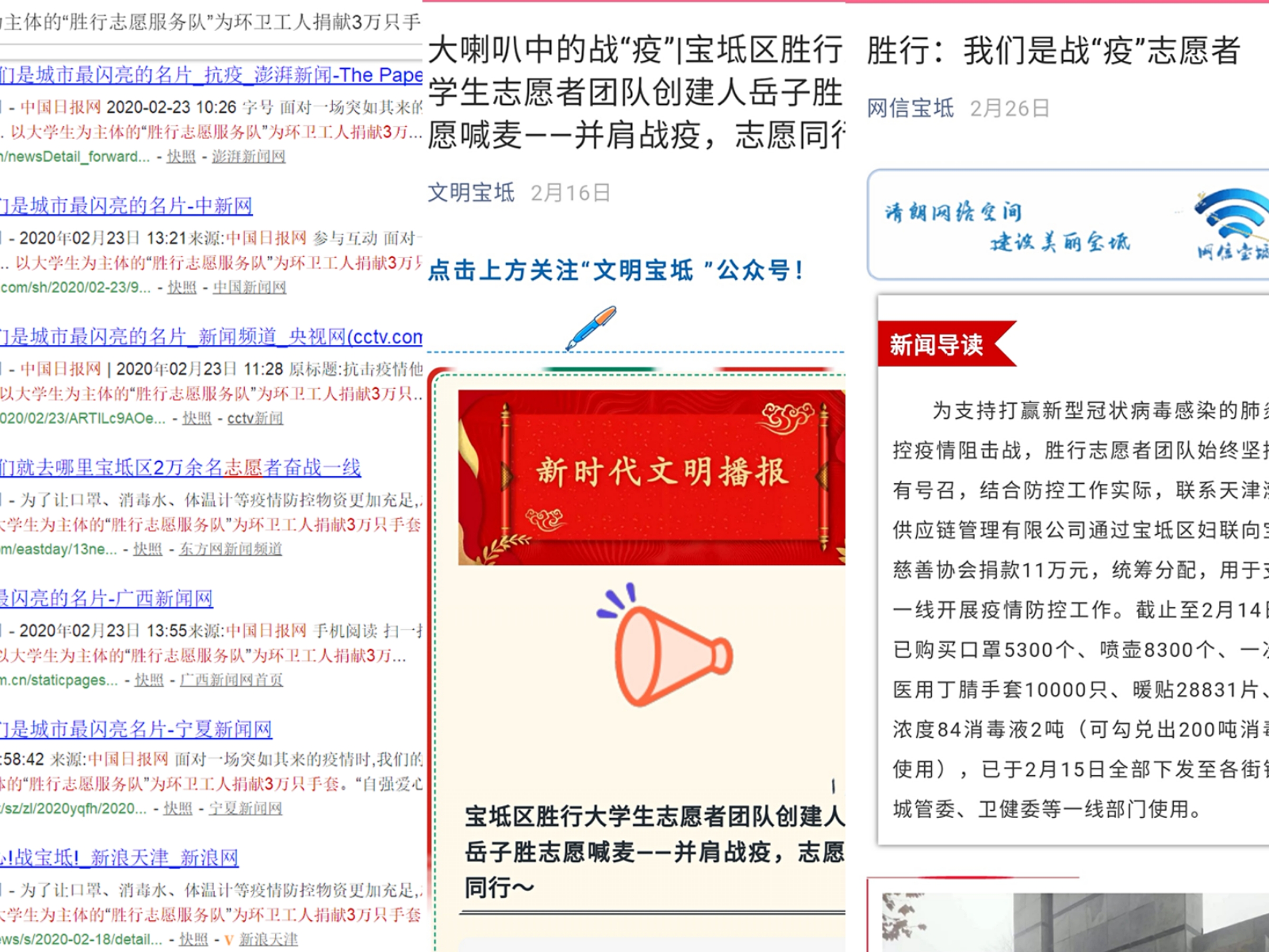 后记: 中国日报网于2月23日对胜行大学生志愿者团队的抗疫志愿服务进行了报道,该报道被多家媒体转载;同时,岳子胜和他的团队事迹被津云、宝坻融媒、网信宝坻、文明宝坻、宝坻半边天等多家媒体专题报道,这是对他们志愿服务的充分肯定。这也是我对他的第二次约稿,当我再次提出要在学校宣传他的事迹时,他还是很谦逊地说:“没什么可值得宣传的,我就是干了点青年应该干的事”。虽然隔着手机屏幕,我也能想象他用一口天津话出这样一句话时,面露微笑的阳光样子。而当我进一步说明更多的是想借此弘扬青春正能量,发挥朋辈教育力量,他才欣然接受。就是这样一个不慕名利,踏实做事的青年志愿者,让我深受感动,觉得更应该弘扬这种青春正能量,展示青年的担当与作为。(文/图:邓菁菁、岳子胜;审稿:胡燕青) 中国日报网:https://cn.chinadaily.com.cn/a/202002/23/WS5e51ea2aa3107bb6b57a1a0e.html