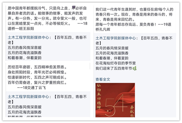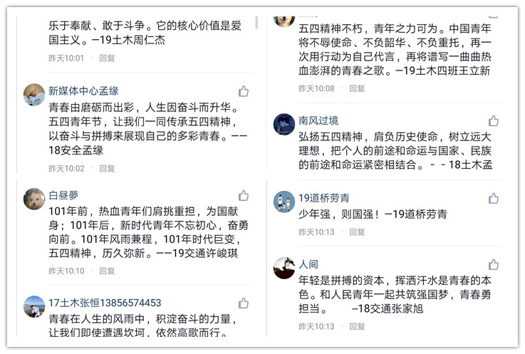 5月4日上午,土木学院发布了“青春有我”歌颂五四精神的主题文章,两百多名同学转发评论,表达了自己“铭记历史,珍爱和平,不忘初心,牢记使命”的决心。“青年需要有朝气蓬勃的活力,有持之以恒的毅力。青春是用来奋斗的,自古英雄出少年,今天五四精神的接力棒已经传到了新一代青年手中,我们更要用一种不辱使命的精神,不忘初心的态度接力跑下去,为自己的人生、为国家的复兴赢得一个光明的未来。”焦琳淳同学在评论中写道。 这次“青春有我”纪念五四运动系列活动旨在引领青年们为了时代建设放飞梦想,为了振兴中华民族努力奋斗,成为朝气蓬勃的青年人!(图/文:王月竹 王辰阳;审稿:胡燕青) |