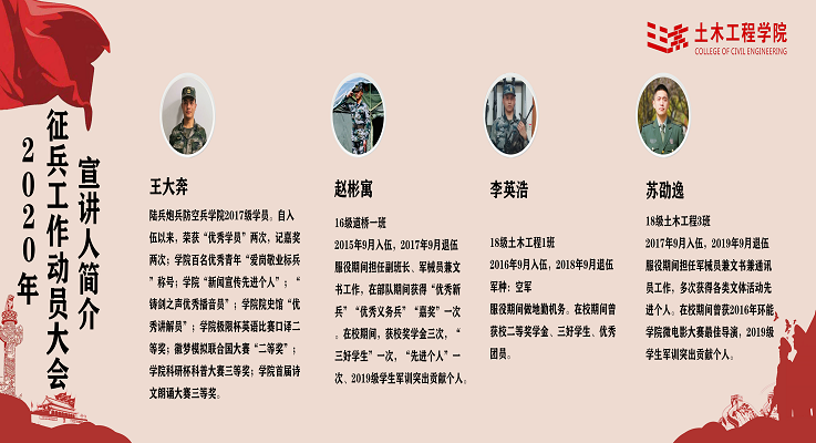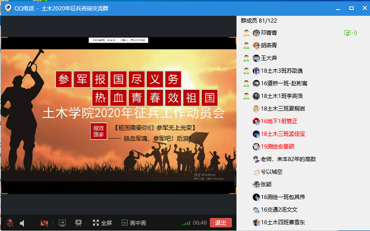 本网讯 为切实做好征兵服务工作,进一步动员同学们投身军营,为国防和军队建设注入新活力,6月19日,土木学院召开线上征兵工作动员会。本次动员会特邀陆军炮兵防空兵学院优秀学员王大奔、土木学院优秀退伍学生赵彬寓、李英浩、苏邵逸作征兵宣讲。参加本次动员会的有学院党委副书记胡燕青、各专业辅导员及学生代表,共计100余人。动员会由土木学院征兵工作联络人邓菁菁主持。