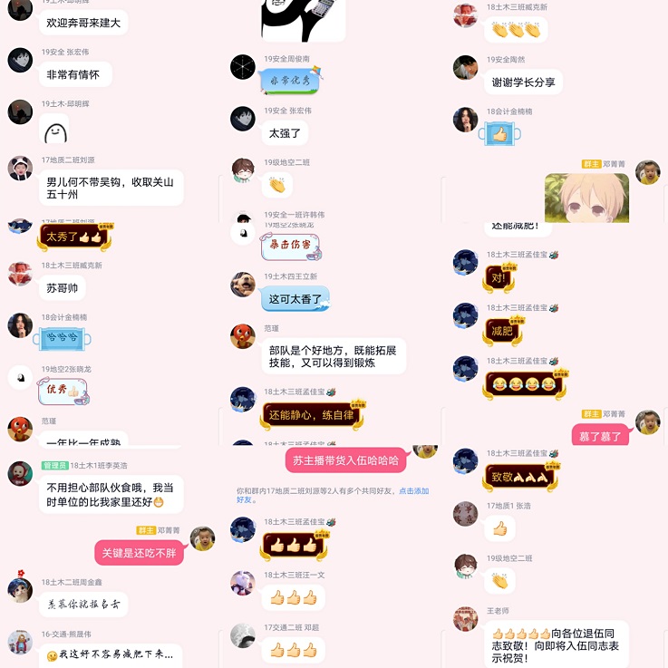 本次动员会主要分为宣讲交流、入伍政策解读和学院领导总结发言三个环节。宣讲交流环节,四位宣讲人结合自己的入伍经历和体验感悟,向同学们作了生动的宣讲交流,增强了同学们对部队生活的具象认识和国防意识,也进一步激发了同学们不断拼搏的奋进精神和入伍热情。期间,线上互动活跃,宣讲效果良好。随后,邓菁菁解读了入伍的相关政策,使同学们进一步了解入伍流程以及明确入伍的意义。最后,胡燕青作总结发言,他从国防层面、学生层面、政策层面,深入地分析了大学生入伍的重要意义,鼓励有志青年携笔从戎,绽放青春能量,实现家国理想!