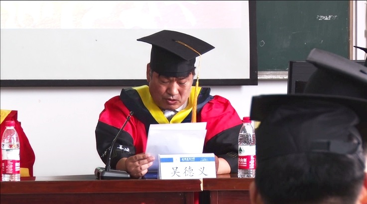 土木学院院长吴德义致辞。他代表全院教职员工向2020届毕业生表示祝贺。他把毕业生比作骏马雄鹰。“骏马志在草原,雄鹰终属蓝天”。他希望毕业生们在驰骋飞翔时能够做到以下三点:一是爱岗敬业,不忘初心;二是善学是能,好学是品。三是诚信友善,自强不息。